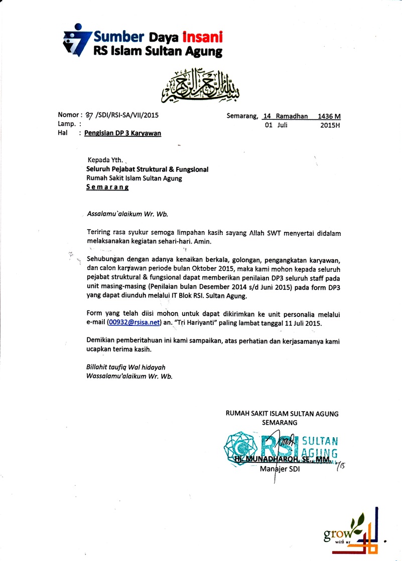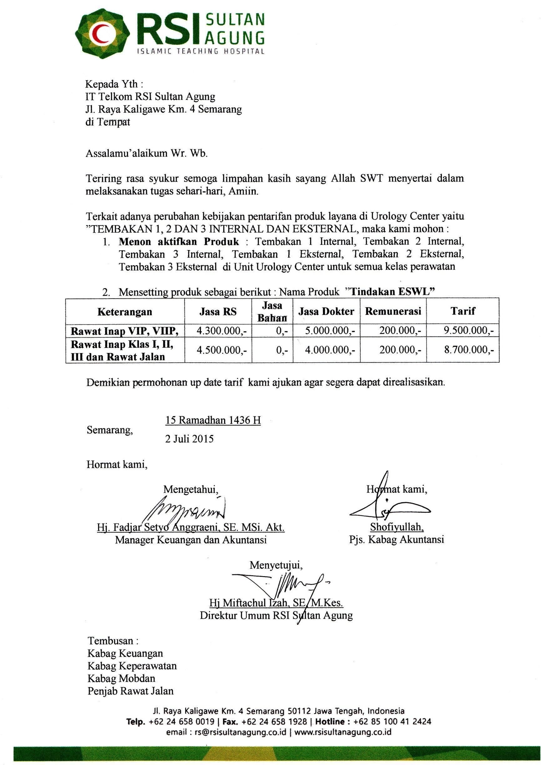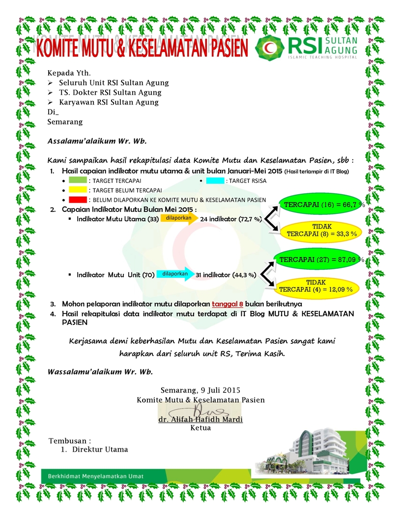 Menindaklanjuti hasil pertemuan Tim Akreditasi Rumah Sakit Islam Sultan Agung hari Jum'at, tanggal 19 Juni 2015, bersama ini kami sampaikan :