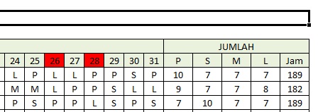 Dengan formula tersebut jumlah formasi shift dan jam kerja akan langsung terjumlah secara otomatis ketika jadwal diketikkan.